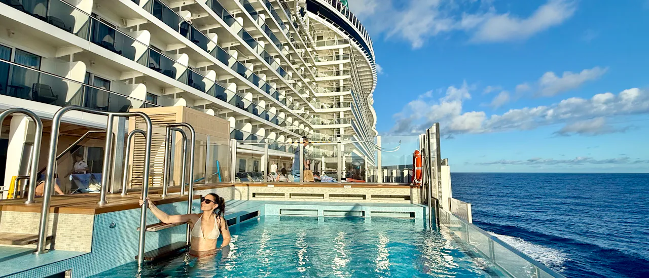 Pääuima-allas Norwegian Aqualla yläkannella. Taustalla näkyy Aqua slidecoasterin tunnelia.