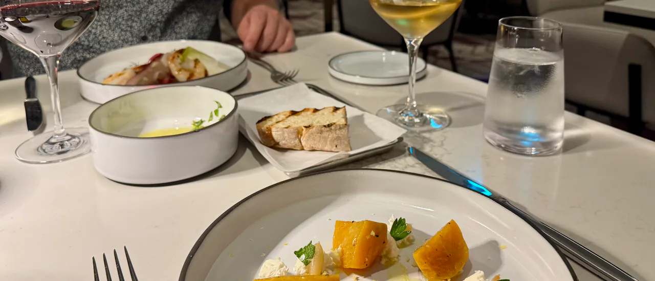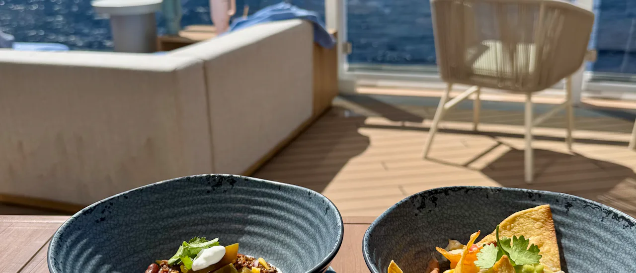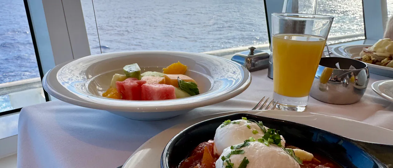 Aamupalalla laivan á la carte oli monipuolisin valikoimaltaan. Suurin osa menusta pysyi samana risteilyn koko ajan, mutta lisäksi oli joitain päivän erikoisuuksia, kuten yhtenä aamuna oikein hyvää shakshukaa. Lounaan ja illallisen menu vaihtuu päivittäin. Jos halusi nauttia aamupalan tai lounaan ulkona syöden, siihen oli kaksi vaihtoehtoa: Indulge Food Hall ja The Local Bar & Grill. Näistä ensimmäinen nousi ykkössuosikiksemme. Molemmissa on laajan sisätilan lisäksi myös terassit, joilta saa ihastella merta ja maisemia. Indulge Food Hallissa on pöydissä tabletit, joista saa tilata useiden eri maiden keittiöistä pieniä ruoka-annoksia. Tarjoilijat tuovat ne suoraan pöytään. Lounaalla tämä oli oikein toimiva ja herkullinen konsepti. Sen sijaan aamupala täällä oli pienoinen pettymys, sillä se oli buffet-tyylinen ja hyvin perustasoinen valikoimaltaan. The Local Bar & Grill -ravintolassa tarjoillaan nimensä mukaisesti pubi-tyylistä ruokaa ja nämä tilataan tarjoilijalta suoraan pöytään niin aamupalalla, lounaalla kuin illallisellakin.