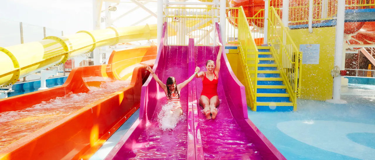 Suurimmalla osalla Carnivalin laivoista on mahtavat vesipuistot. Kisaile kaverin kanssa, kumpi laskee lujempaa vierekkäisistä liukumäistä.