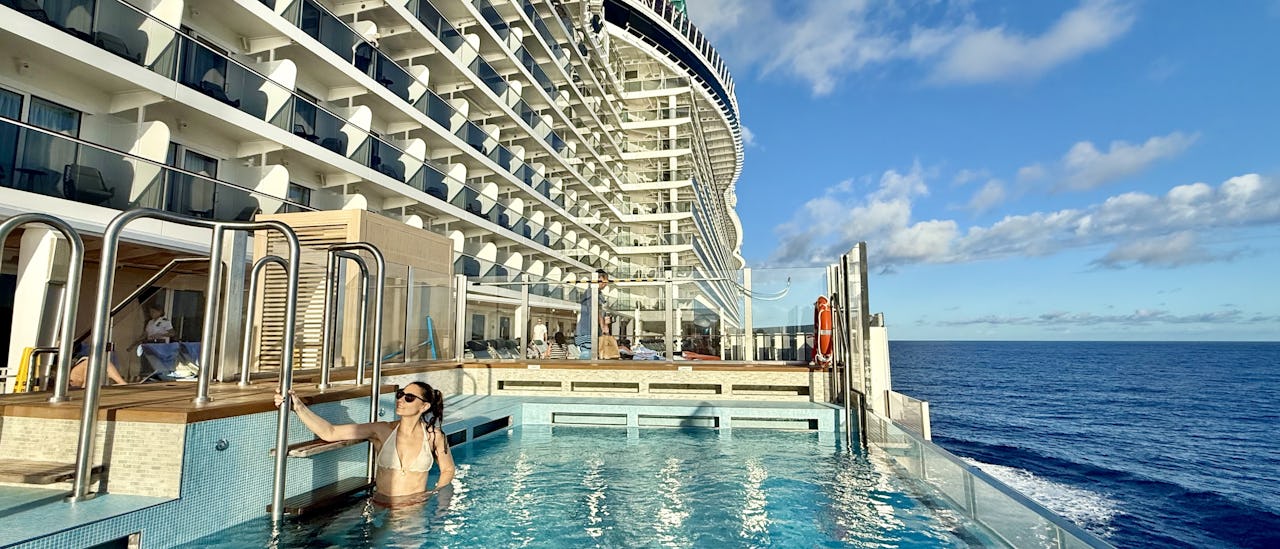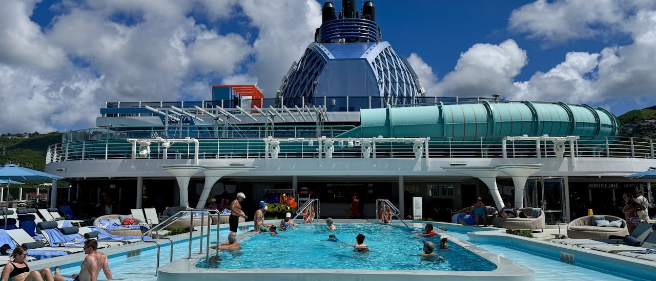 Pääuima-allas Norwegian Aqualla yläkannella. Taustalla näkyy Aqua slidecoasterin tunnelia.