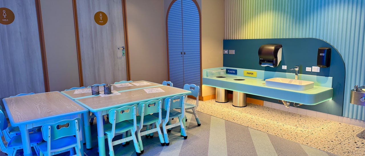 Kaikissa ravintoloissa oli syöttötuoleja näkyvillä ja tarjoilijat tuovat ne suoraan pöytään, mikäli lasten kanssa saapuu ravintolaan. Illallisella pääruokaravintolassa viereisen pöydän lapsille tuotiin puuhakirjat, jotta he jaksaisivat paremmin istuskella pöydässä aikuisten ruokaillessa. Hyttiin saa pienille lapsille matkapinnasängyn, mutta on hyvä huomioida, että hygieniasyistä laivoilla ei ole pottia. Kannattaa siis ottaa oma matkapotta mukaan, jos pöntöllä käyminen ei vielä luonnistu, mutta lapsi ei ole enää täysin vaippaikäinen.