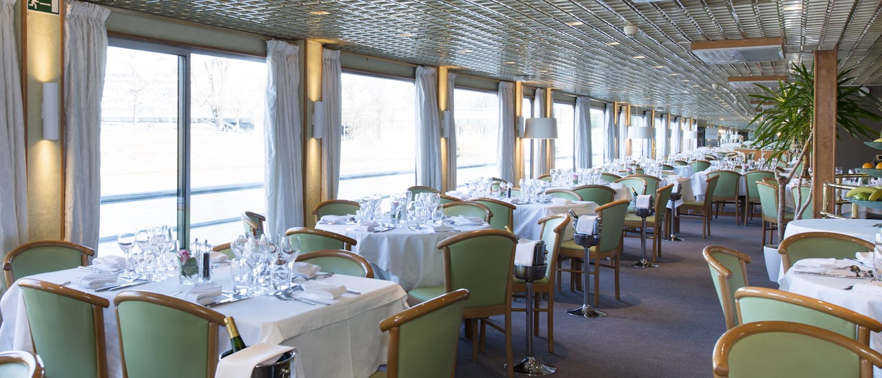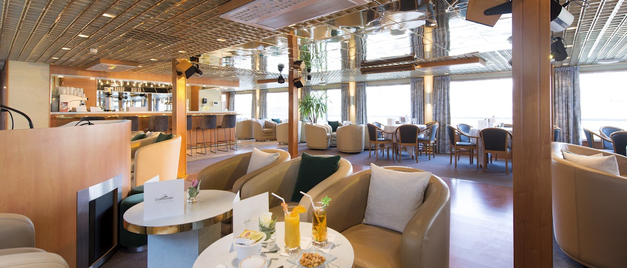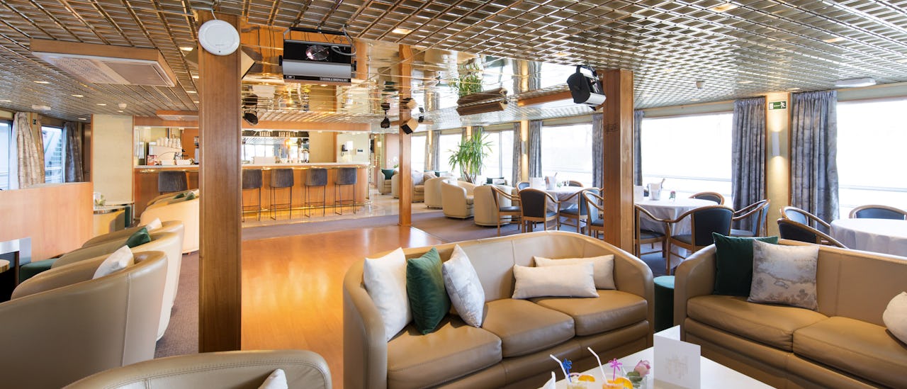 The lounge tastefully decorated, is located at the front of the ship and offers panoramic views. Cocktails and games, dancing, and other forms of entertainment all happen here.