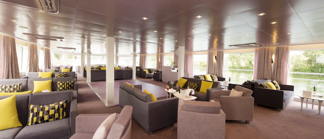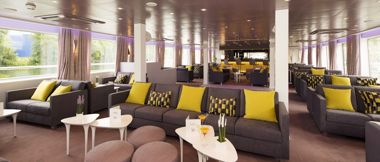 The lounge tastefully decorated, is located at the front of the ship and offers panoramic views. Cocktails and games, dancing, and other forms of entertainment all happen here.