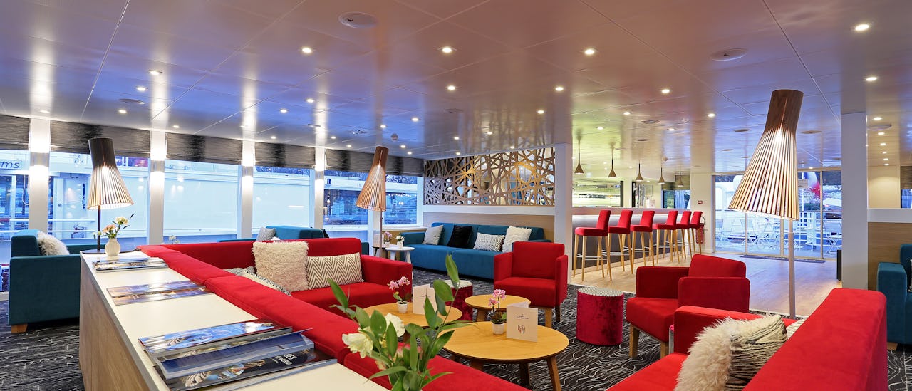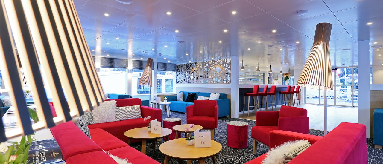 The lounge tastefully decorated, is located at the front of the ship and offers panoramic views. Cocktails and games, dancing, and other forms of entertainment all happen here.