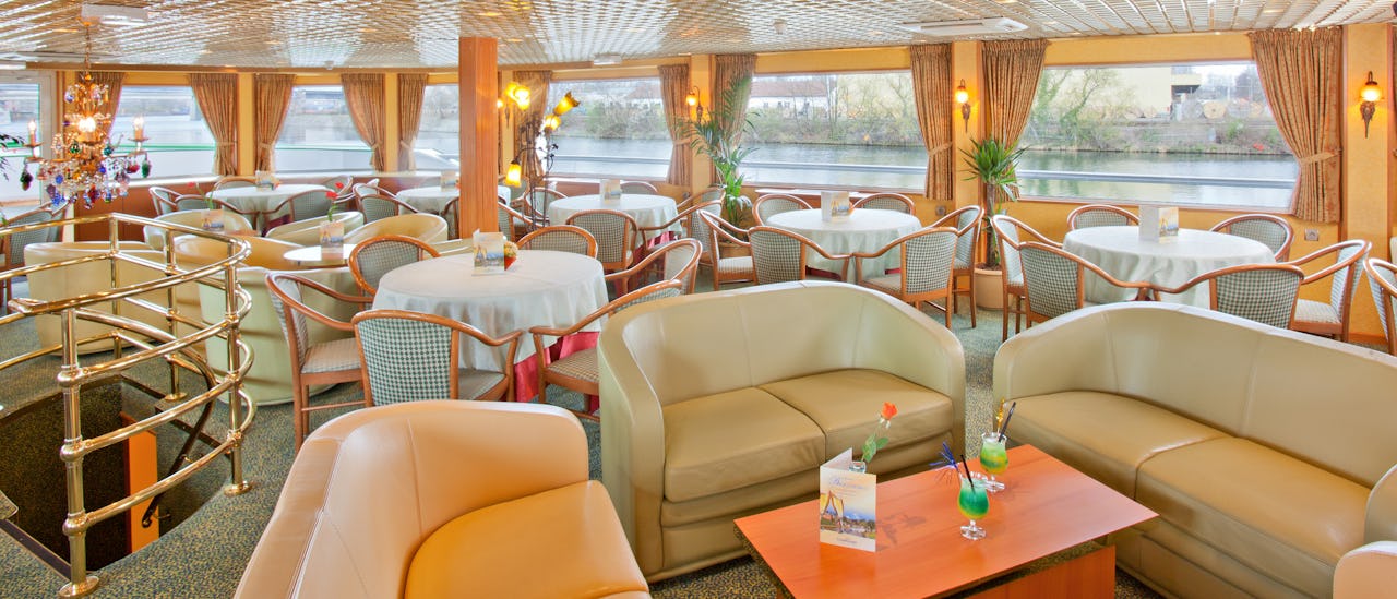 The tastefully decorated lounge is located at the front of the ship and offers panoramic views. Cocktails and games, dancing, and other forms of entertainment all happen here.