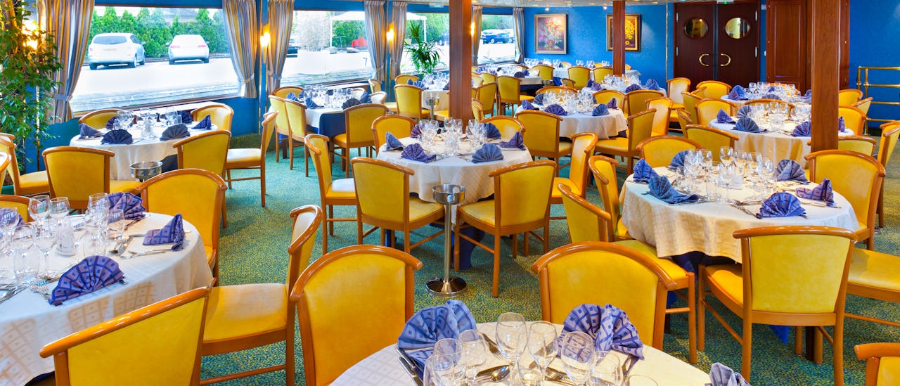 The main restaurant is located on the main deck and is where all meals are served. It seats all guests at tables which vary in size with a panoramic view. The atmosphere is casual but elegant.