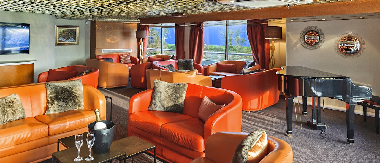 The tastefully decorated lounge is situated at the front of the ship and provides panoramic views. Here, you can enjoy cocktails, play games, dance, and partake in various forms of entertainment.