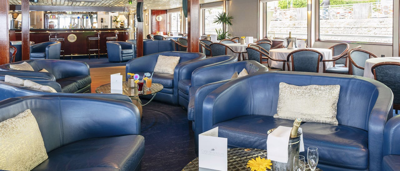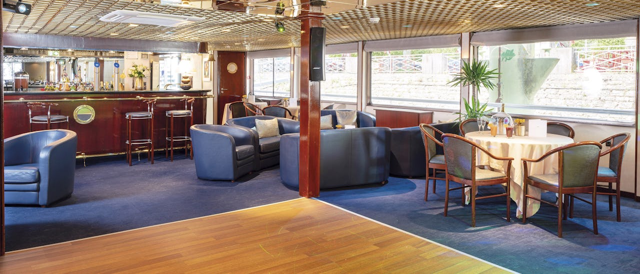 The lounge tastefully decorated, is located at the front of the ship and offers panoramic views. Cocktails and games, dancing, and other forms of entertainment all happen here.