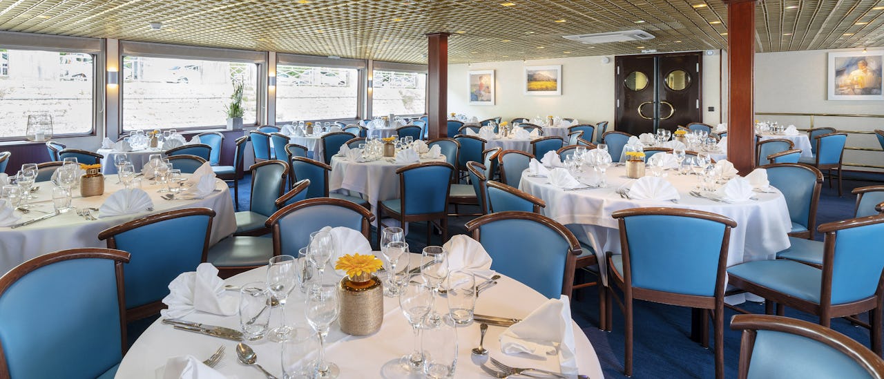 Located on the upper deck, the restaurant is where all meals are served during your cruise. The atmosphere is casual but elegant.