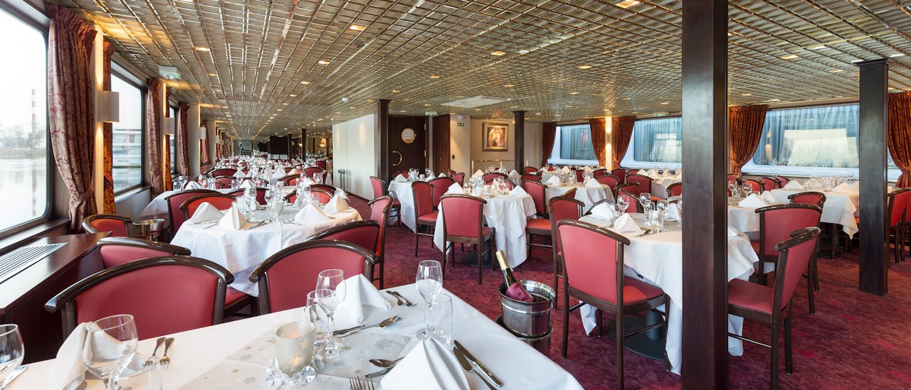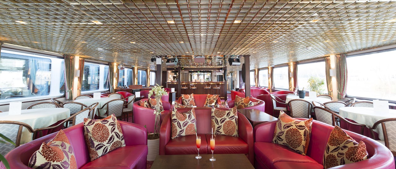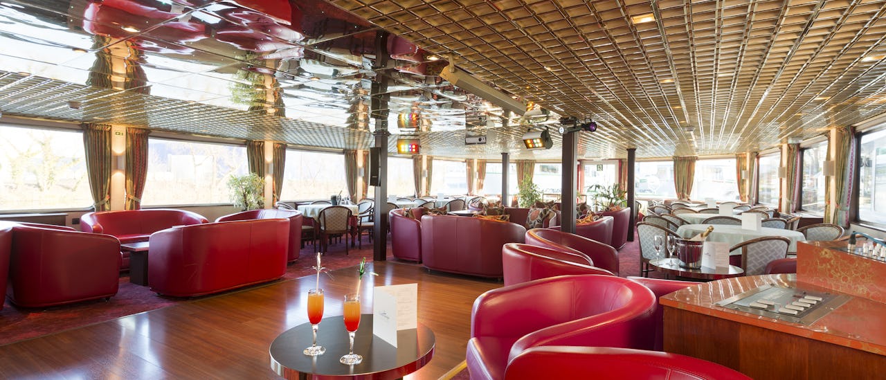The lounge tastefully decorated, is located at the front of the ship and offers panoramic views. Cocktails and games, dancing, and other forms of entertainment all happen here.