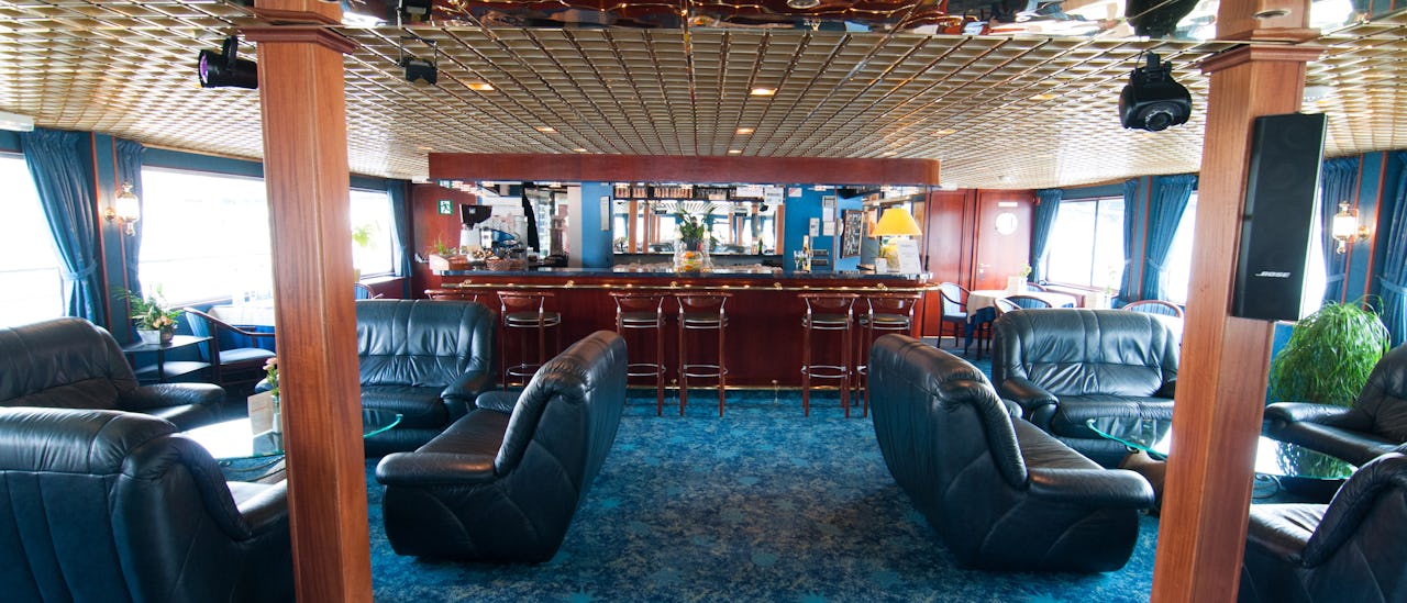 The lounge tastefully decorated, is located at the front of the ship and offers panoramic views. Cocktails and games, dancing, and other forms of entertainment all happen here.
