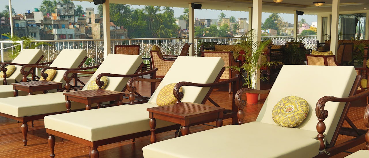 The lounge bar is the ideal spot to indulge in delightful cocktails and a variety of Indian and international wines, all while soaking in the breathtaking views of the Ganges River.