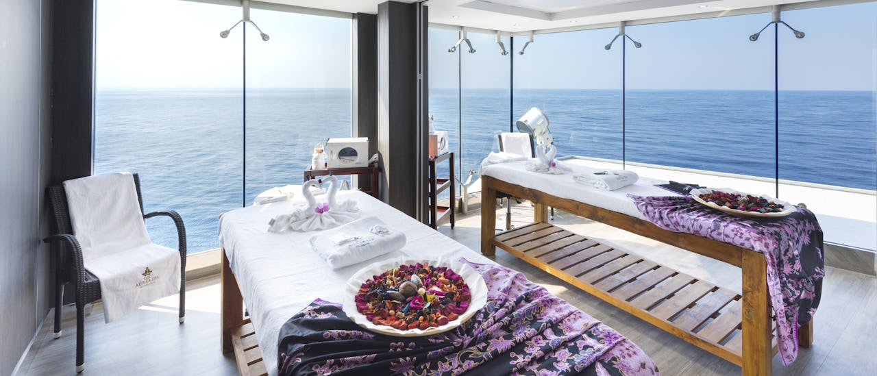 Yläkansilla odottavat monet ihanat uima- ja porealtaat, kuntosali ja kylpyläosasto.
