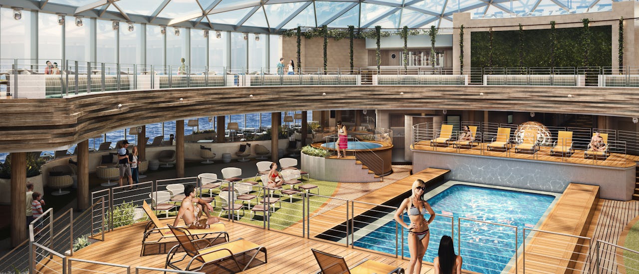 The 970m² retractable SkyDome glass roof is the special entertainment feature of the ship