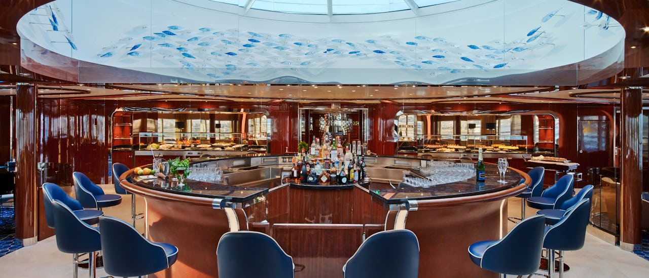 Istahda showloungeen tai vietä aikaa Sky Baarissa, josta on huikeat näkymät allaskannelle merimaisemineen.